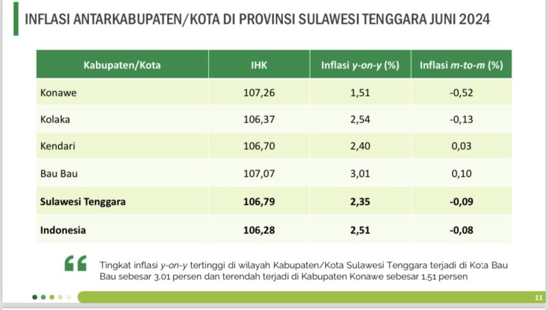 Dalam keterangan tersebut angkat infasi Kota Kendari dari bulan ke bulan yakni Juni 2024 berada diangkat 0,03% angka tersebut mengalami penurunan yang dibulan sebelumnya yakni Mei 2024 berada diangka 0,09% angka tersebut menempatkan Kota Kendari diposisi ketiga tertinggi di Sultra dibawah Kabupaten Konawe yang minus 0,52% dan Kolaka minus 0,13%.